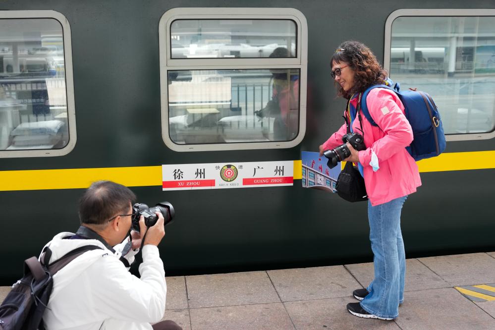 1日,在广州火车站,市民在K303次列车旁拍照留念。新华社记者 吴鲁 摄